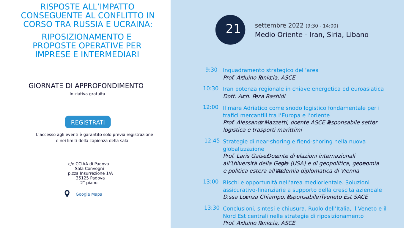 13:30 Conclusioni, sintesi e chiusura. Ruolo dell’Italia, il Veneto e il Nord Est centrali nelle strategie di riposizionamento Prof. Arduino Paniccia, ASCE
